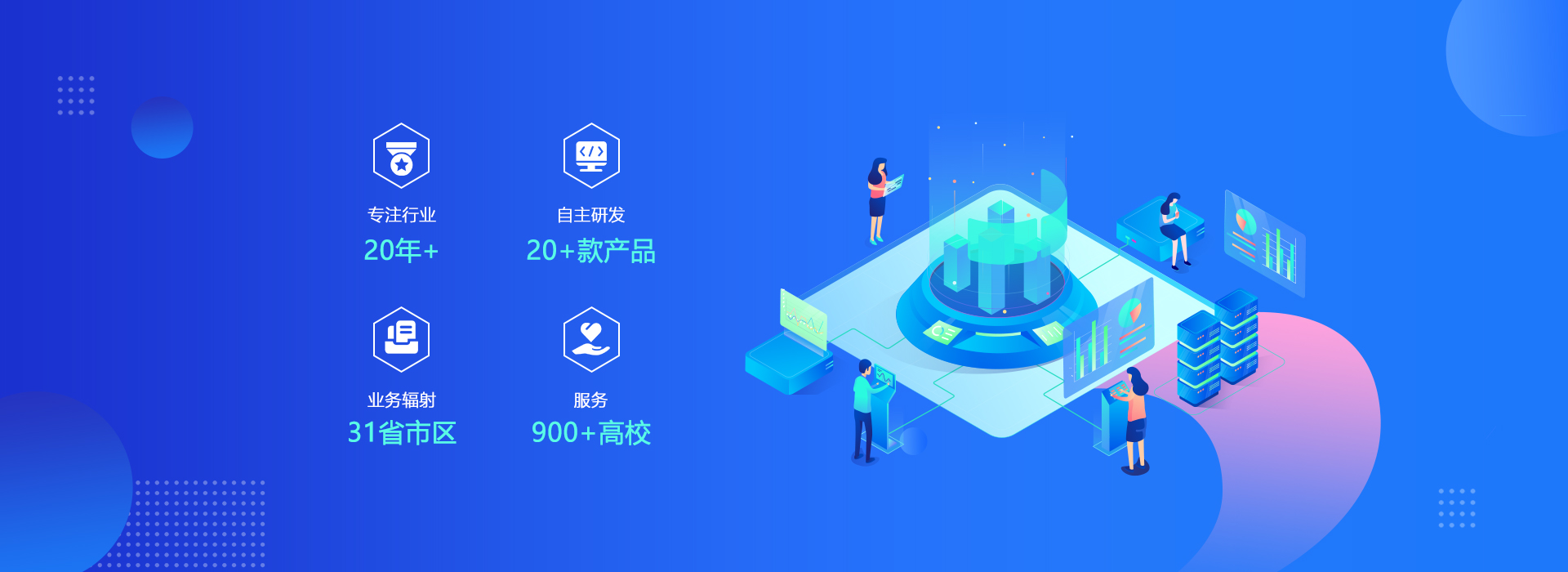 自主研發(fā)了教學(xué)微服務(wù)平臺(tái)、研究生綜合管理平臺(tái)、職業(yè)院校質(zhì)量管理信息平臺(tái)、本科教學(xué)質(zhì)量保障平臺(tái)、智慧校園信息平臺(tái)、一站式學(xué)生工作數(shù)字化平臺(tái)、智慧后勤綜合管理平臺(tái)等20多款產(chǎn)品